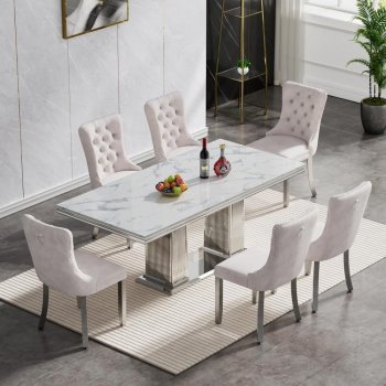 7-Piece Faux Marble Dining Set for 6 with Tufted Chairs