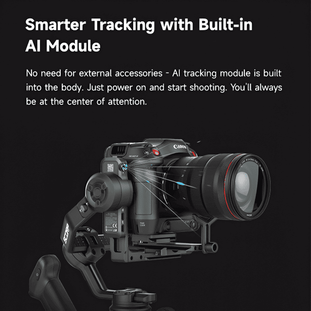 The revolutionary feature is its detachable control handle with built-in AI tracking. Unlike traditional gimbals that require constant manual adjustment, this system lets you detach the control handle and operate your camera remotely while the AI tracking automatically keeps your subject perfectly framed. The combination of professional 7.7-pound payload capacity with intelligent tracking technology means you get both the power to handle heavy camera setups and the smart features to make filming easier.